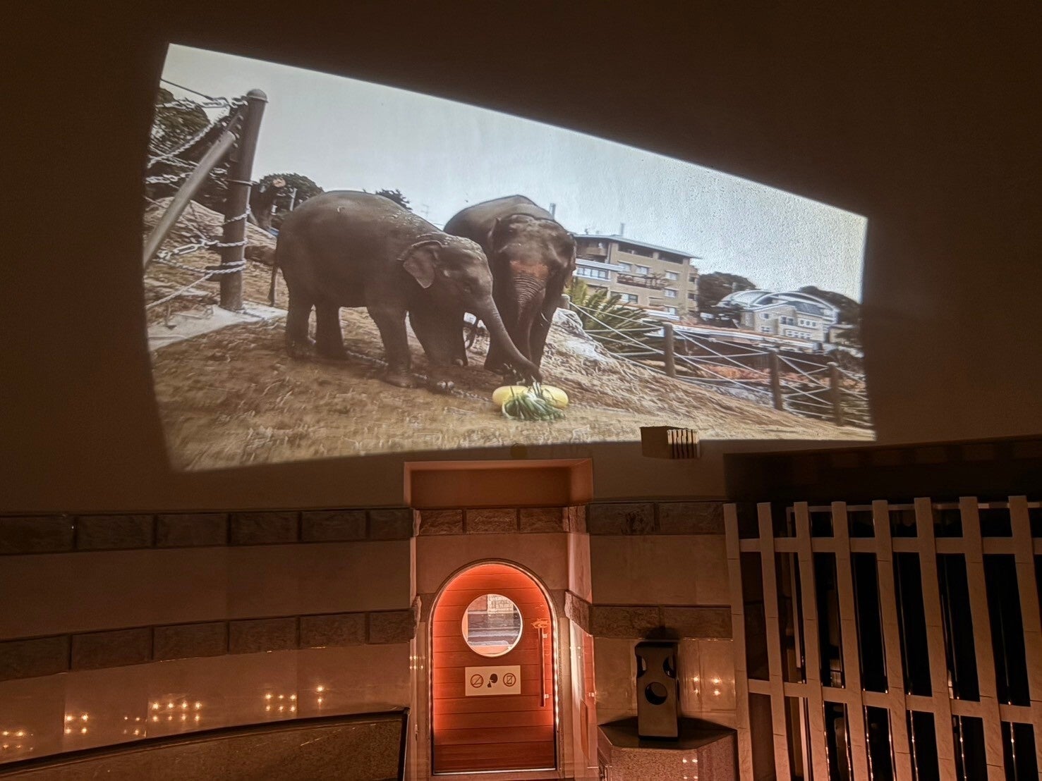 ・天井に飼育員さんが撮影した動物達の秘蔵映像が流れるコラボ岩盤浴室