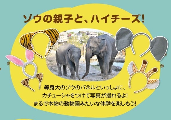 等身大の象のフォトパネルの前で、動物のカチューシャも貸出しているので、