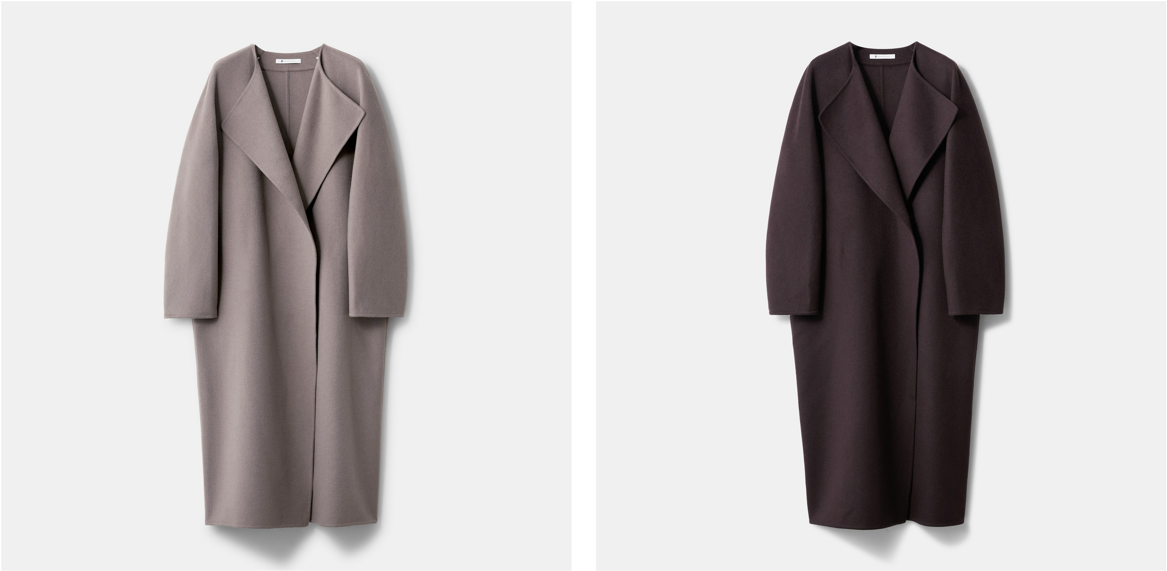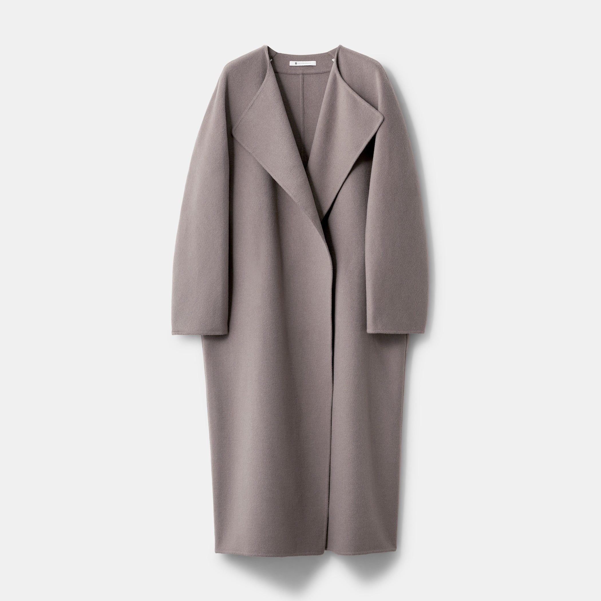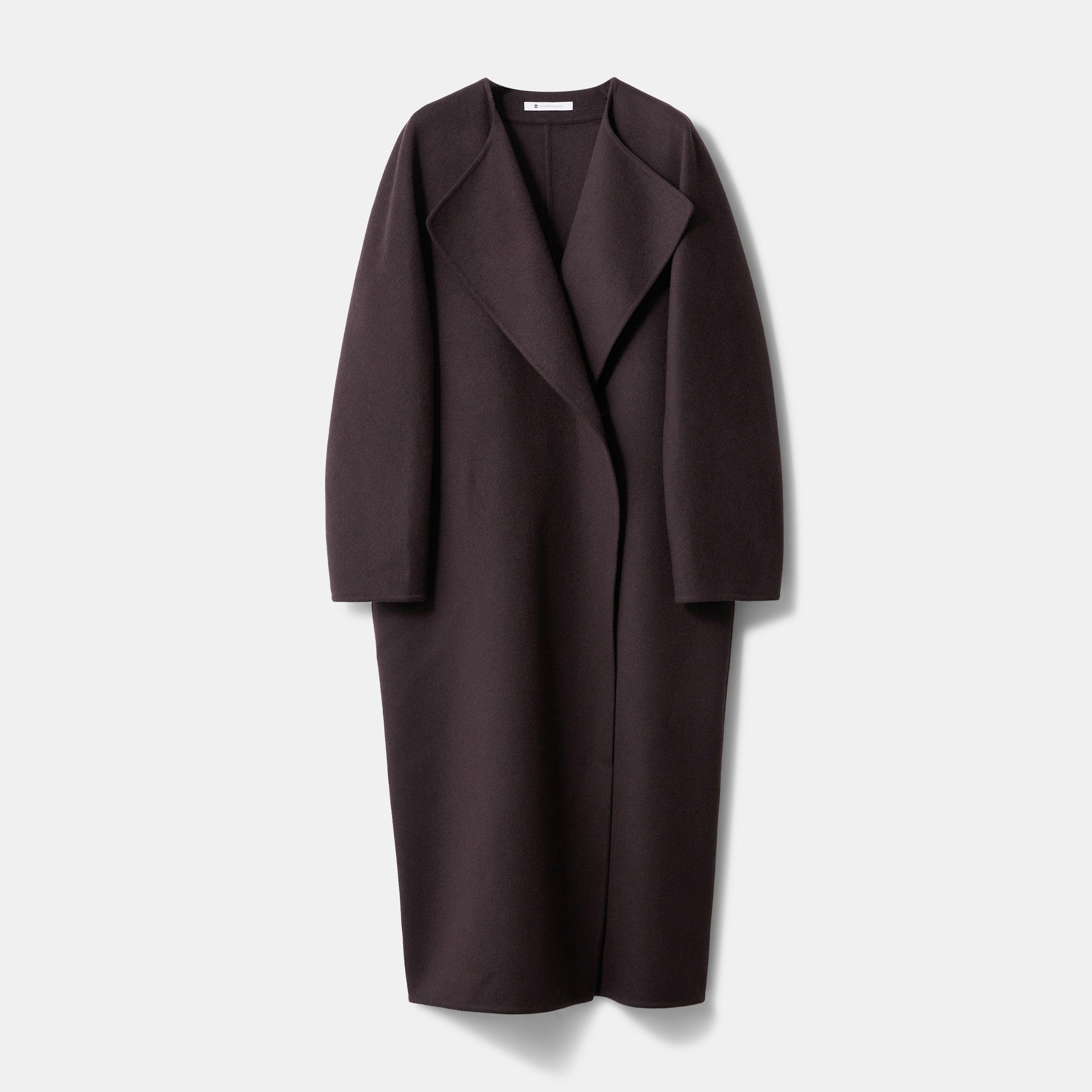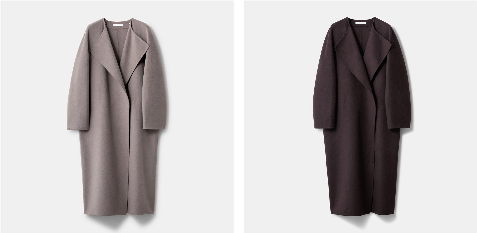 カシミヤ混ならではの高級感とぬくもりを感じる、リバー仕立てのロングコート。長めの着丈と、体をやさしく包み込むような丸みのあるシルエットが特徴です。一枚羽織るだけでスタイリングが完成する、存在感のある一着に仕上げました。
