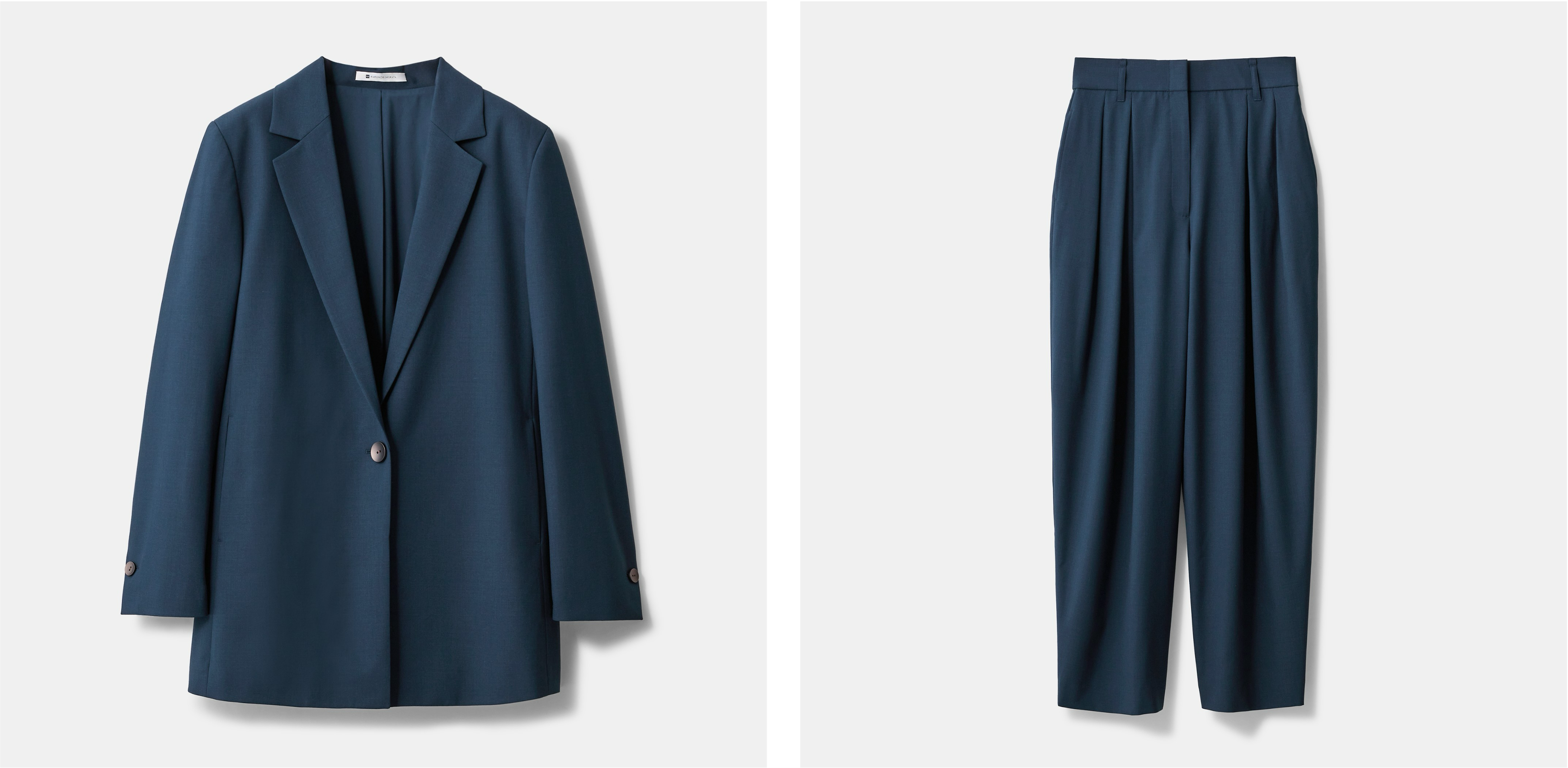落ち感があり、仕立て映えする上質感のある素材を使用したウールブレンドのオーバーサイズジャケットとワイドテーパードパンツ。