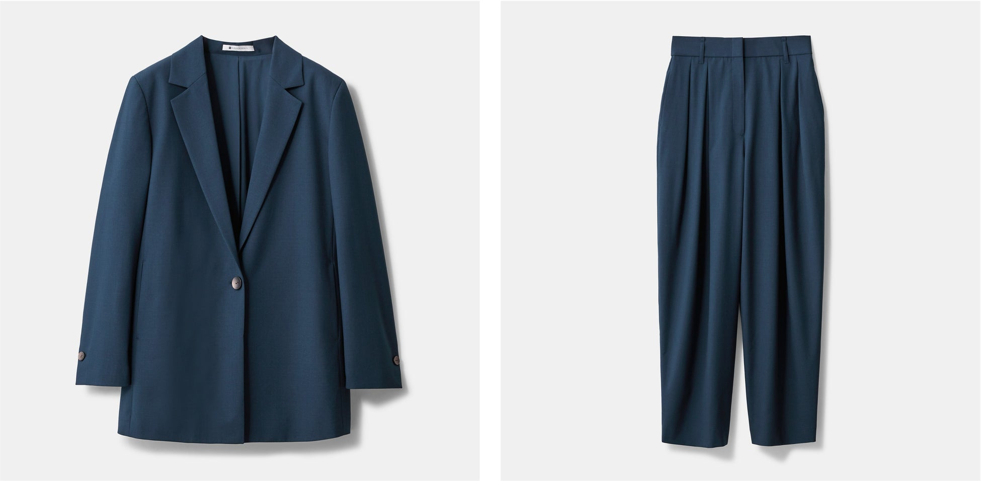 落ち感があり、仕立て映えする上質感のある素材を使用したウールブレンドのダブルジャケットとワイドテーパードパンツ。