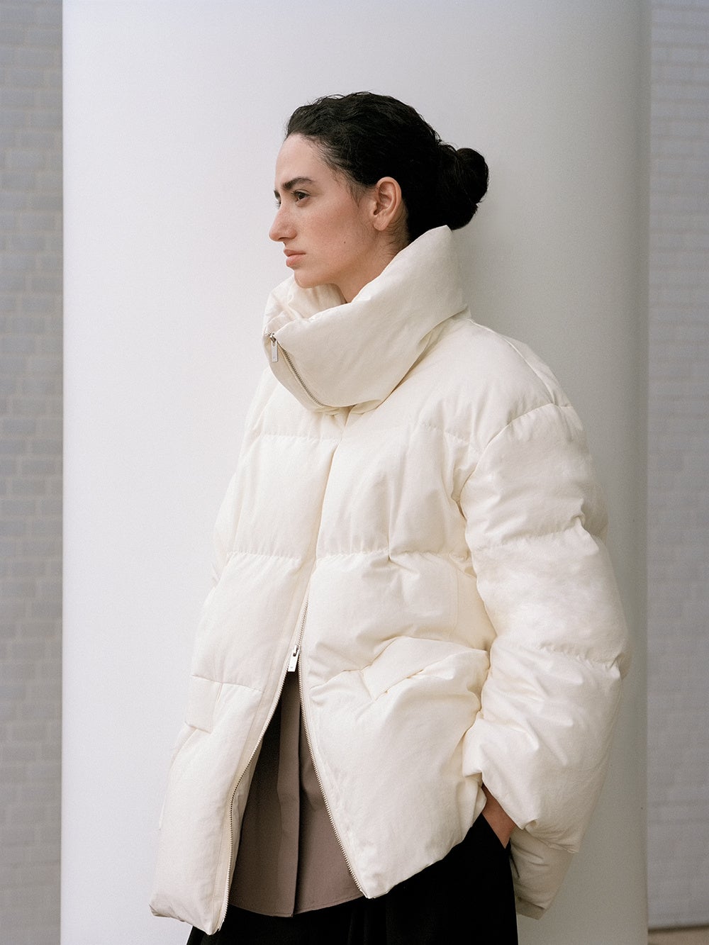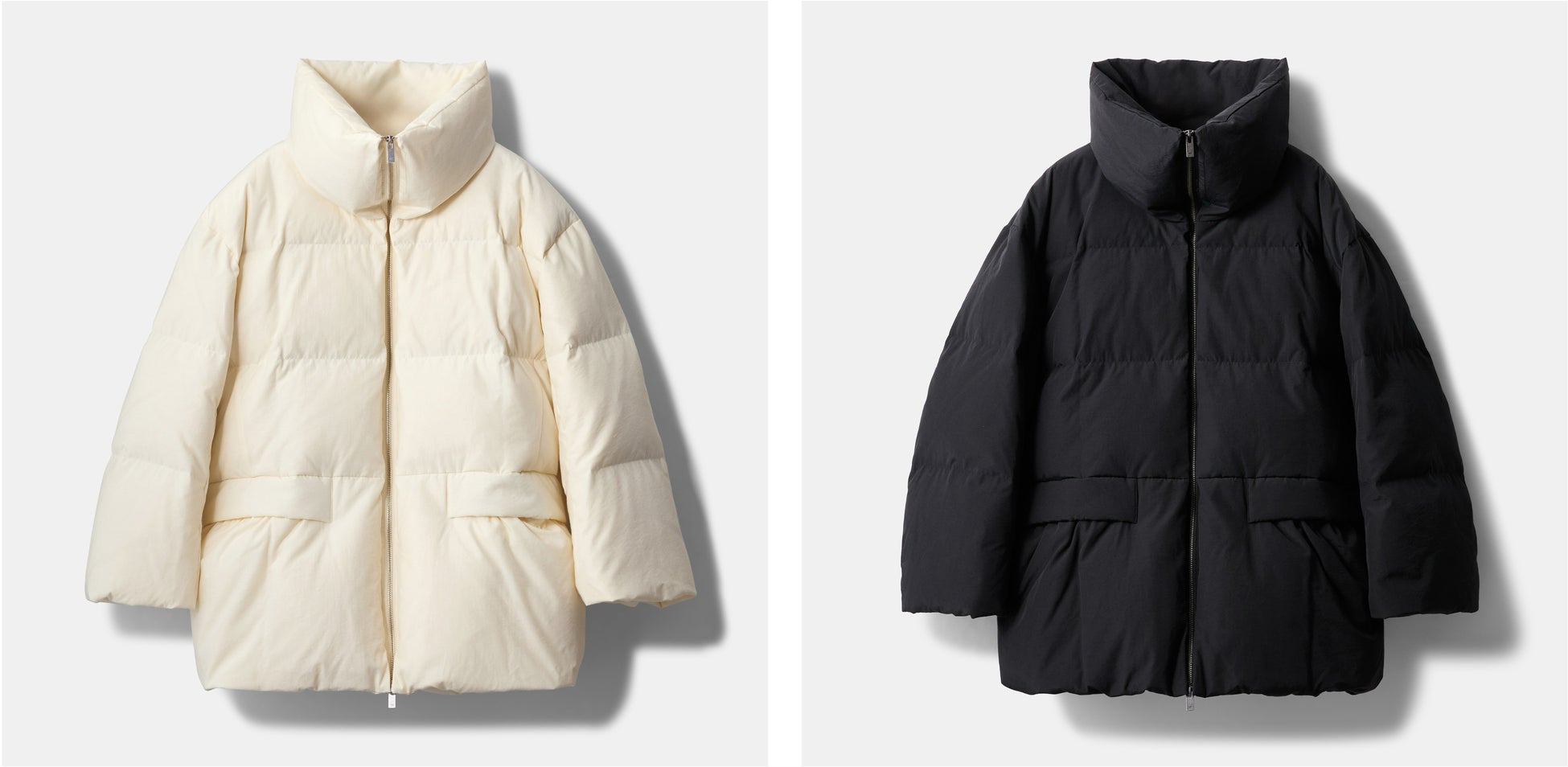 今回のコレクションのインスピレーションにもなっている“ぬくもり” を、表面のシボ感で表現したオーバーサイズシルエットのダウンコート。ウエストと裾はドローコードでシルエットの調整ができ、スタイルアップも叶います。また、上下どちらからも開閉できるダブルジップ仕様により、その日の気分に併せて印象を変えた着こなしを楽しめます。