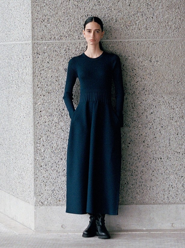 体のラインを拾いにくい素材を選び、ウエストからフレアに広がるシルエットのバランスが美しい、フィット&フレアシルエットのニットワンピース。着る人を上品に引き立てる、「HARUNOBUMURATA」ならではの美学が息づく一着です。