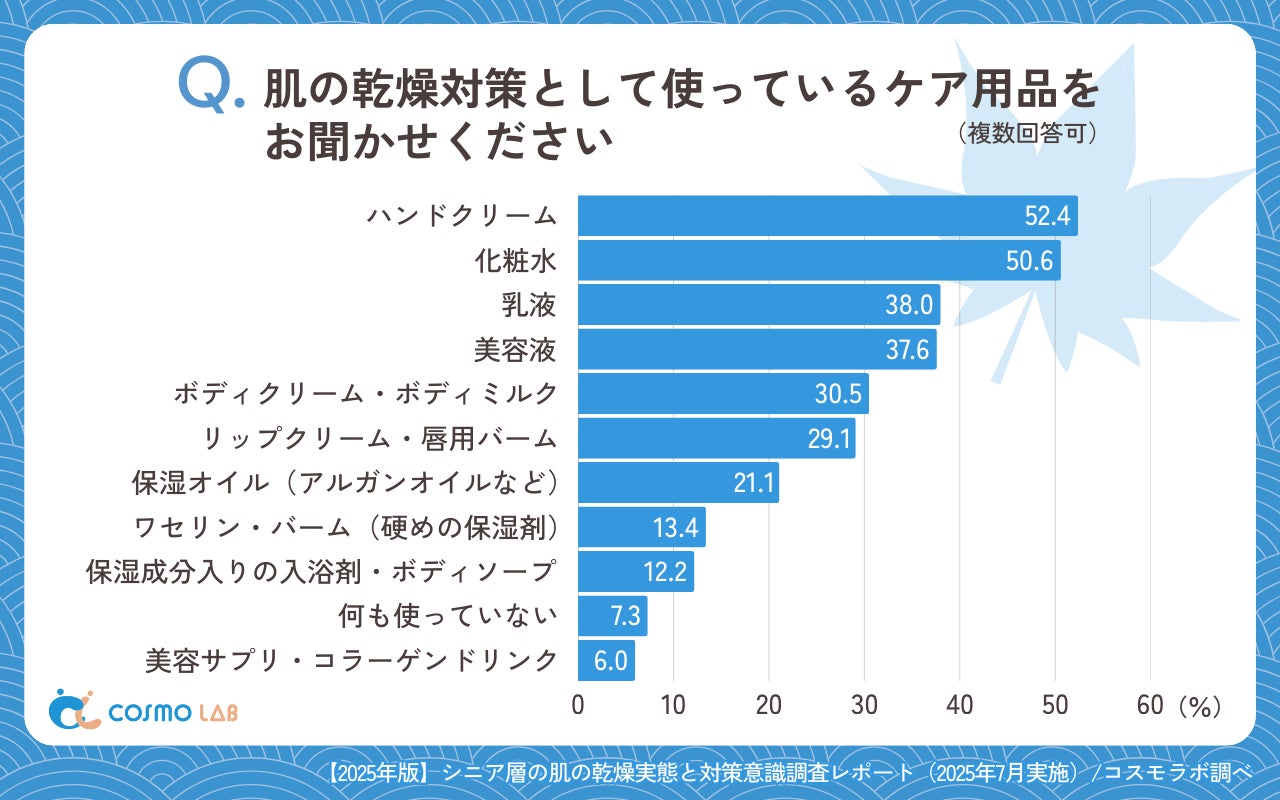 乾燥対策として「ハンドクリーム」(52.4%)と「化粧水」(50.6%)が主流を占め、日常的に使いやすく手軽に入手できるアイテムが選ばれています。シニア世代は複雑なケア方法よりも、継続しやすく効果を実感できるシンプルなアプローチを重視する傾向があり、実用性を最優先にした選択行動が見て取れます。