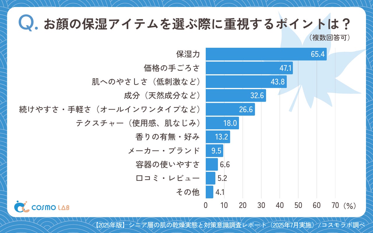 保湿アイテム選びでは「保湿力」(65.4%)や、「価格の手ごろさ」(47.1%)、「肌へのやさしさ(低刺激など)」(43.8%)が上位を占め、効果・価格・安全性のバランスを重視しています。シニア世代は製品選択において機能性と経済性の両立を求める傾向が強く、確実な効果を適正価格で得られる製品への選好が明確に表れています。