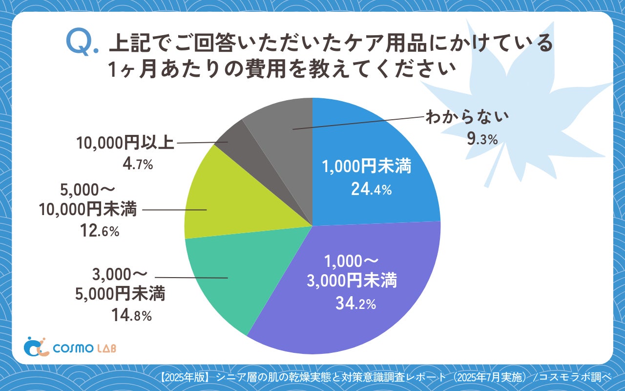 「1,000〜3,000円未満」(34.2%)が最多で、「1,000円未満」(24.4%)、「3,000〜5,000円未満」(14.8%)が続きます。5,000円以上(17.3%)は比較的少数で、支出は低価格帯に集中しています。約6割が月3,000円未満に収めている結果は、シニア世代が乾燥対策において費用対効果を重視する堅実な消費行動を取っていることを示しています。