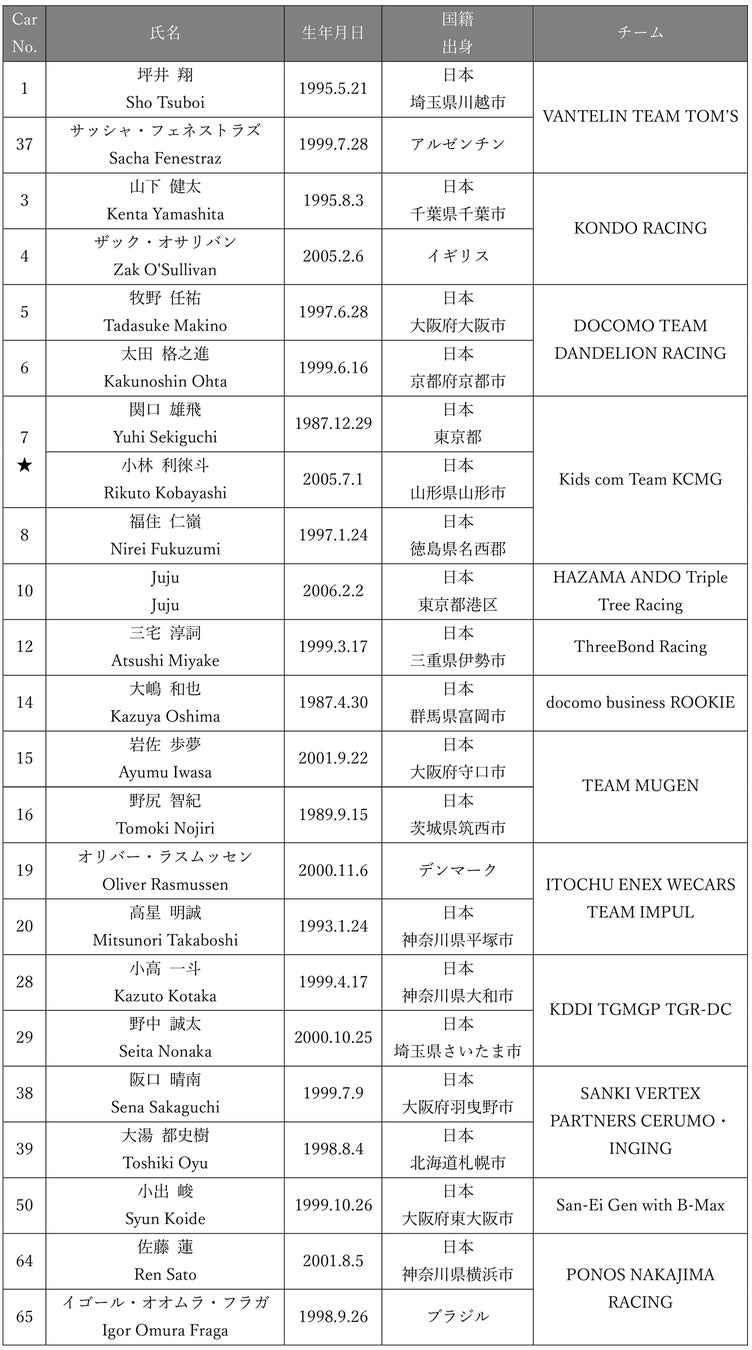 2025 SUPER FORMULA 第2 回公式テスト エントリーリスト