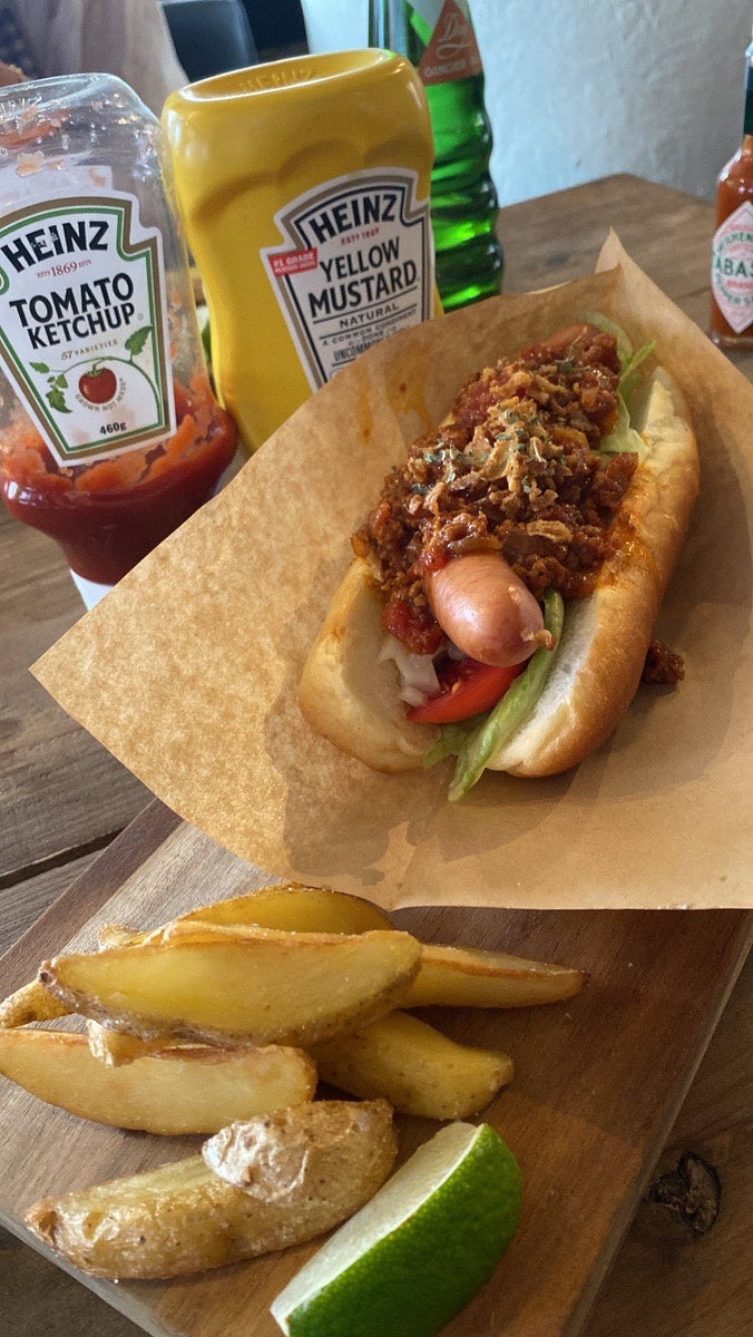 主役は、鹿児島県産の黒豚を使った肉厚ジューシーなソーセージ、スパイシーなチリソースと自家製ガーリックオイルで旨味と刺激を演出。SDGsを意識した地元野菜をふんだんにトッピング。パンは「橋口ベーカリー」監修のオリジナルバンズを使用しています。