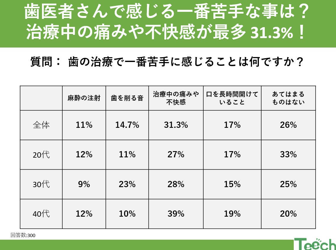 歯医者さんで一番感じる苦手なことは?治療中の痛みや不快感が最多 31.3%!