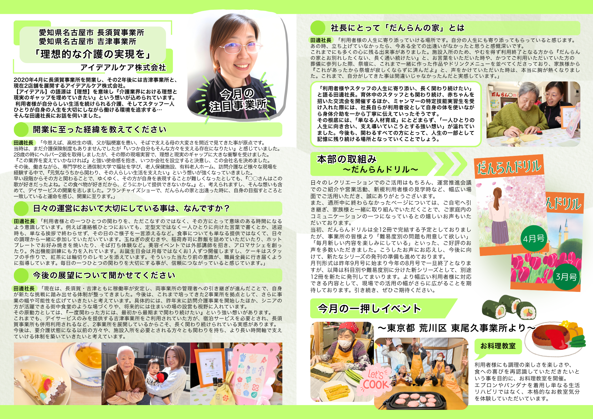 日本介護事業株式会社(本社:東京都墨田区/以下、日本介護事業)は、フランチャイズブランド「だんらんの家」の広報誌『だんらん日和』4月号を発刊しました。今号では、愛知県名古屋市で2事業所を展開するアイデアルケア株式会社の田邊社長へのインタビューを特集。「理想的な介護の実現」を掲げ、利用者様一人ひとりの人生に深く寄り添い続けるその姿勢は、介護現場で働くすべての方の心に響くものです。また、今月は全国4事業所の新規開業情報もお届けします。