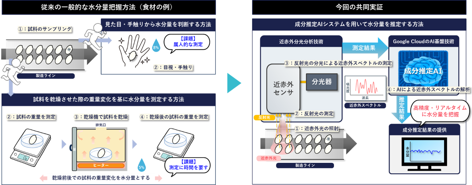 この取り組みの第一弾として、2024年10月より、近赤外分光分析技術とGoogle CloudのAI基盤技術を組み合わせ、食材や樹脂内の水分量を高精度かつリアルタイムに推定する成分推定AIシステムの共同実証を開始しました。