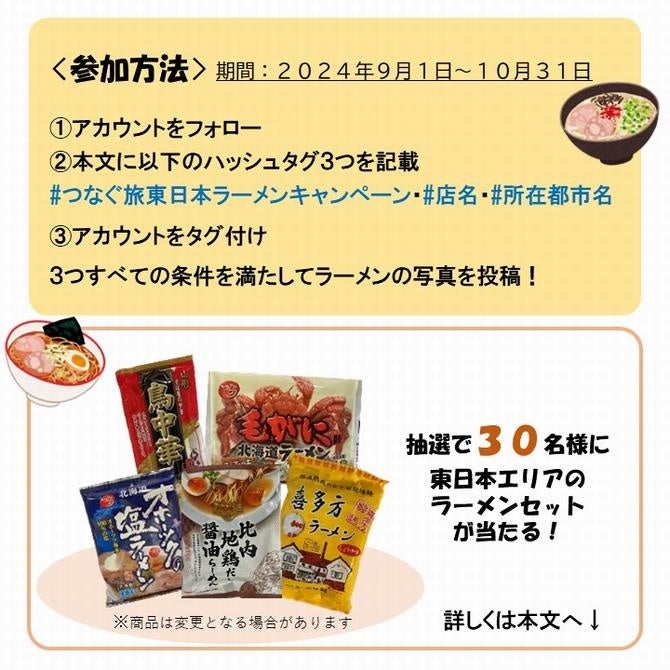 応募期間は、令和6年9月1日(日)から令和6年10月31日(木)まで。指定のハッシュタグ3つを付けて、Instagram「つなぐ旅~東日本~」をタグ付けし、東日本連携都市のお好きなラーメンの写真を投稿してください。