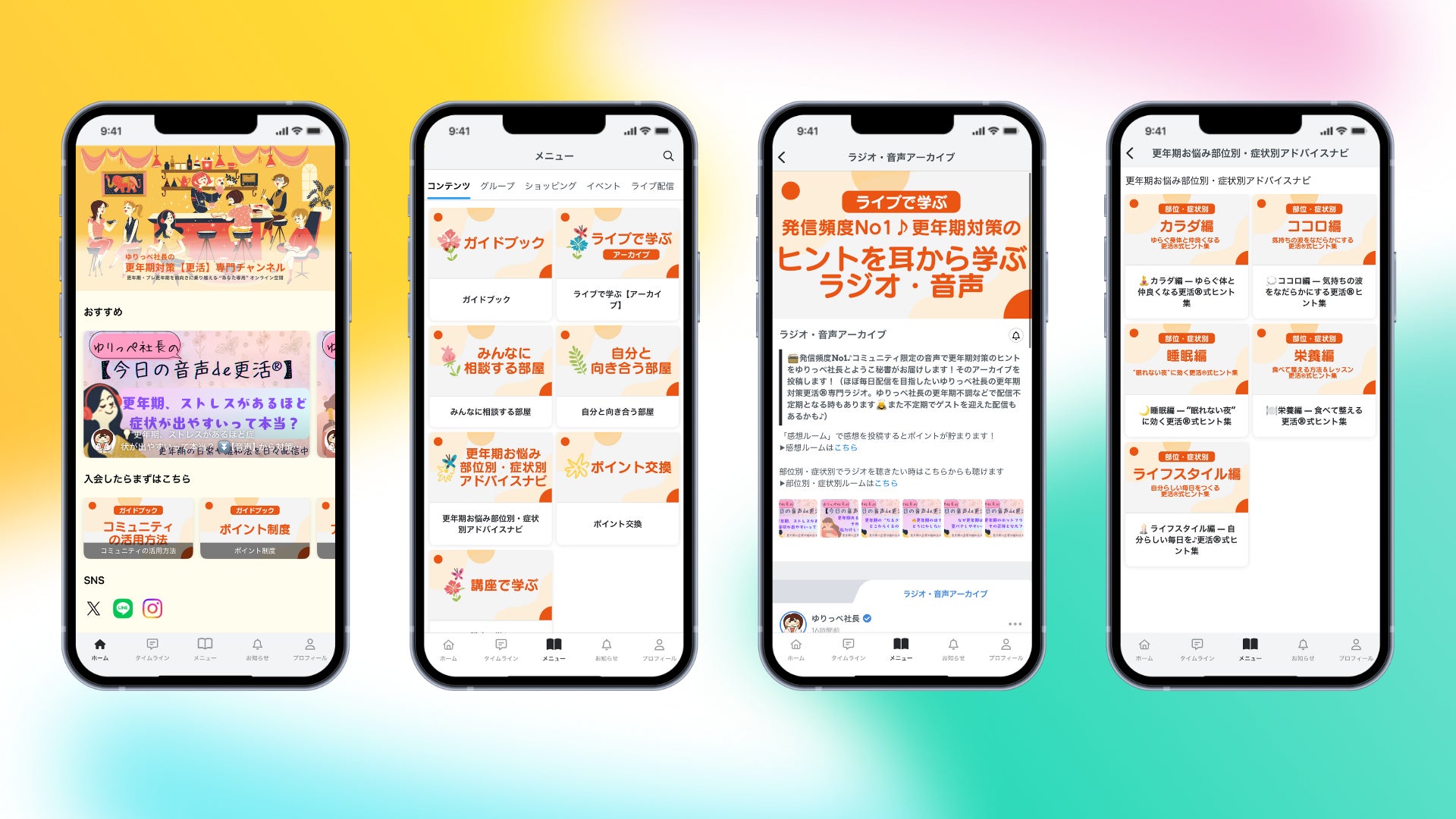 1日3分から始められる音声(更活ラジオ/整えボイス)、動画(お悩み別アドバイス・学び)、毎日のセルフチェック機能、月1の更活タイプ別鑑定書、メンバー同士の交流チャット、専門家とのライブ配信など、実践的かつ続けやすいコンテンツを幅広く提供しています。