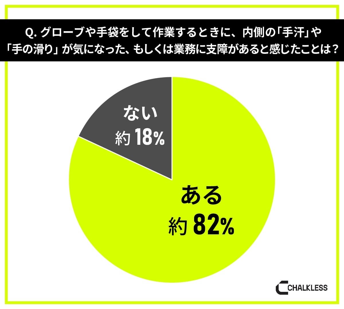 業務中にグローブや手袋の内側の「手汗」や「手の滑り」が気になった人は約82%と、非常に高い割合で手汗や滑りに関する悩みや課題感を持つ人がいることがわかりました。