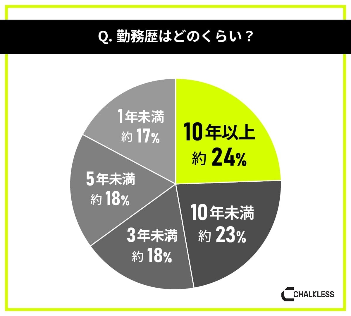今回は全体として30代〜40代、男性、勤務歴は10年未満、10年以上の回答者が多かったです。