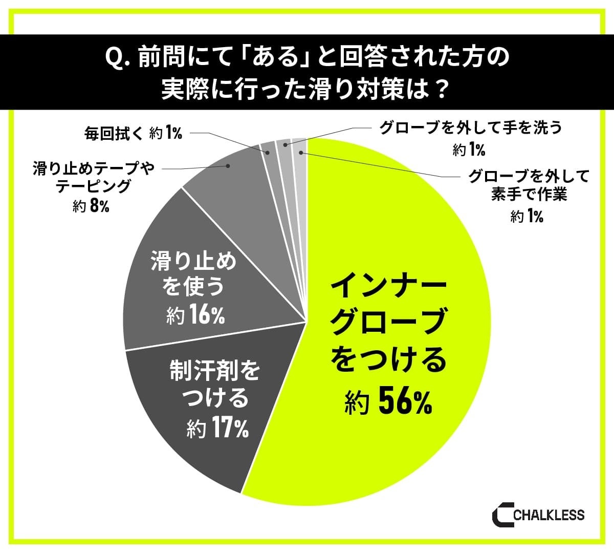 結果は下記のとおりでした。インナーグローブを使用している人が多く、その他滑り止めやテーピングを使用している人もいました。グローブを外して対策する人も一定数いるようです。