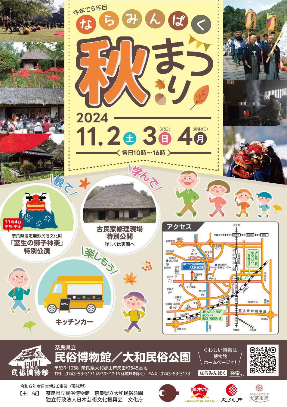 奈良県立民俗博物館・大和民俗公園では、文化・芸術の秋に奈良県の民俗芸能や伝統技術に触れることができるイベントを開催します。