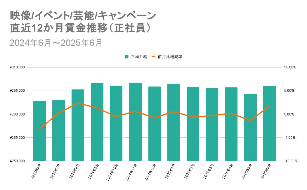 1位の「映像/イベント/芸能/キャンペーン」と17位の「ホテル/旅館/ブライダル」の直近12か月の賃金推移を比較すると、「映像/イベント/芸能/キャンペーン」は月ごとの増減を繰り返しながら平均月給295,000円前後を推移。
