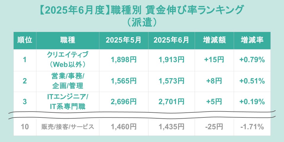 派遣の職種別賃金伸び率ランキング(前月比)トップ3は、1位が「クリエイティブ(Web以外)」(増加額+15円、増加率+0.79%)、2位が「営業/事務/企画/管理」(増加額+8円、増加率+0.51%)、3位が「ITエンジニア/IT系専門職」(増加額+5円、増加率+0.19%)でした。