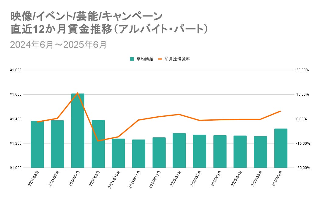 1位の「映像/イベント/芸能/キャンペーン」と13位の「営業/事務/企画/管理」における直近12か月の賃金推移を比較すると、「映像/イベント/芸能/キャンペーン」では2024年7月から8月にかけて、特定の警備会社が高時給の求人を多数出稿したことにより平均時給が大きく上昇。同年9月から10月にかけては、ライブ配信事業を展開する企業が出稿していたライブ配信者を募集する高時給求人が終了した影響で平均時給が減少。以後は横ばいで推移しています。