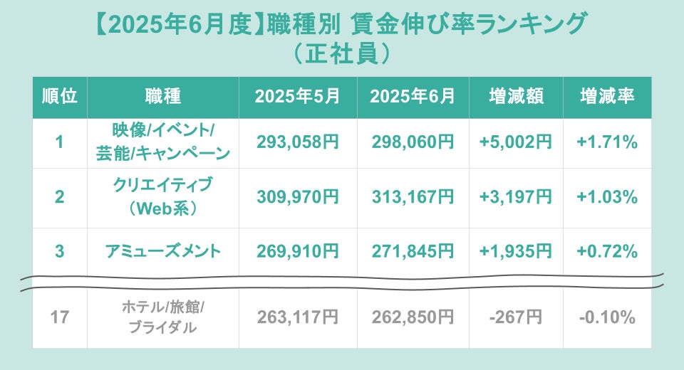 正社員の職種別賃金伸び率ランキング(前月比)トップ3は、1位が「映像/イベント/芸能/キャンペーン」(増加額+5,002円、増加率+1.71%)、2位が「クリエイティブ(Web系)」(増加額+3,197円、増加率+1.03%)、3位が「アミューズメント」(増加額+1,935円、増加率+0.72%)でした。