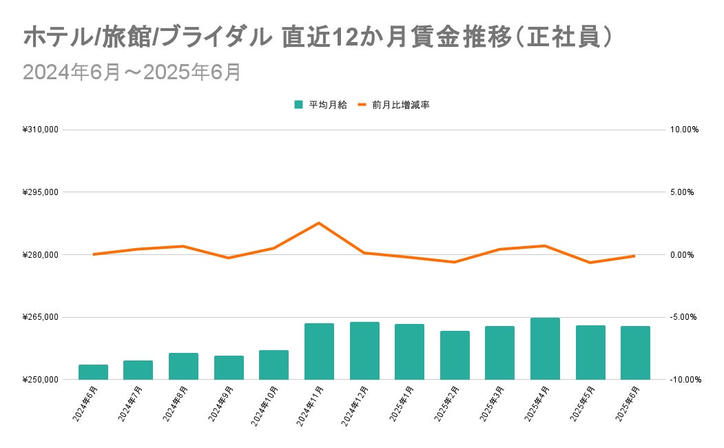 「ホテル/旅館/ブライダル」では、2024年10月から11月にかけて平均月給が上昇してからは、増減を繰り返しつつも平均月給265,000円に近づく勢いで推移しています。