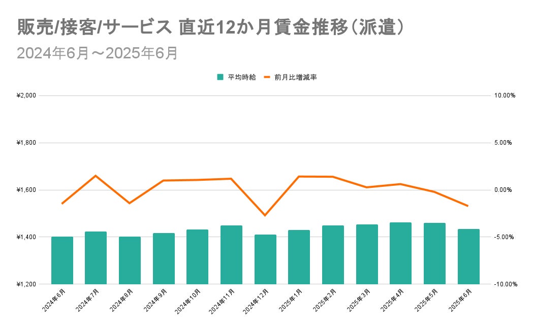 「販売/接客/サービス」では、2024年11月から12月にかけて、複数の派遣企業が出稿していた高時給求人の掲載が終了し、平均時給が減少。以後は平均時給1,400円以上を維持しながら山なりに推移しています。