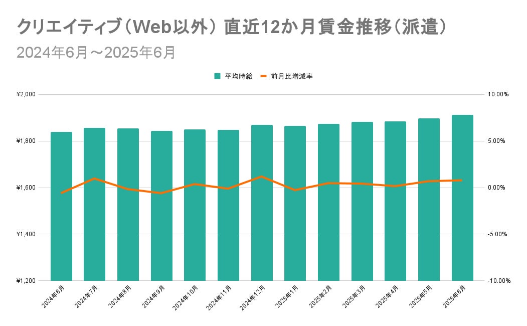 1位の「クリエイティブ(Web以外)」と10位の「販売/接客/サービス」における直近12か月の賃金推移を比較すると、「クリエイティブ(Web以外)」は平均時給1,800円以上の高水準を維持しながら推移し、前月に続き賃金伸び率が1位となりました。