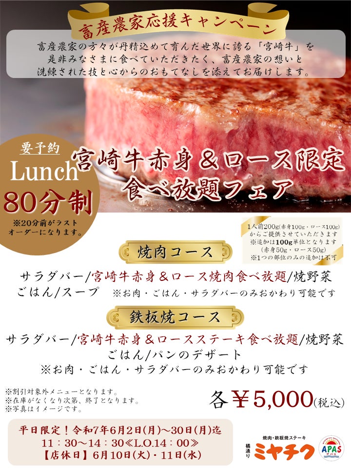 株式会社ミヤチク(本社:宮崎県都城市/代表取締役社長:船ヶ山 祐二)が運営する【ミヤチクレストラン(宮崎県内4店舗、福岡県・大阪府・沖縄県各1店舗ずつ)】にて、6月の平日限定で宮崎牛赤身とロースの食べ放題フェアを開催します。無くなり次第終了となりますので、この機会にぜひ至高の宮崎牛をご堪能下さい!