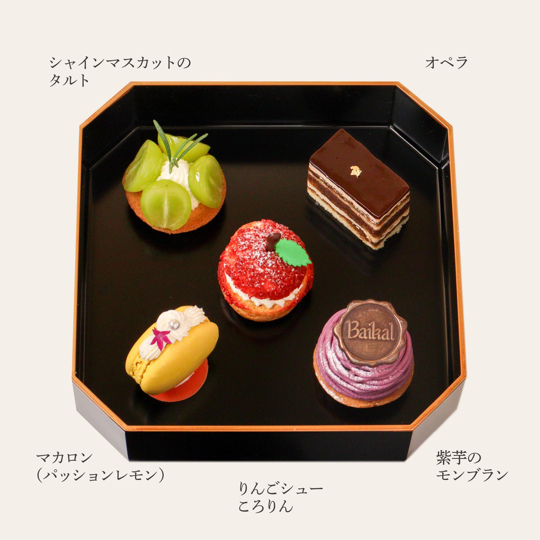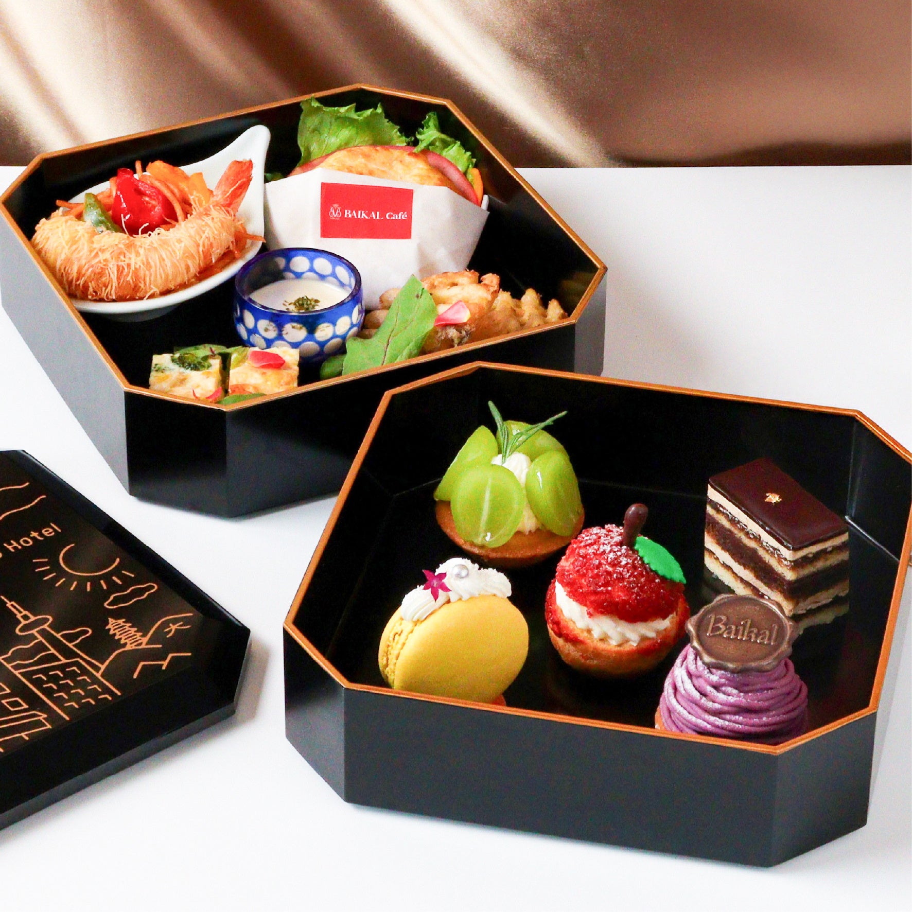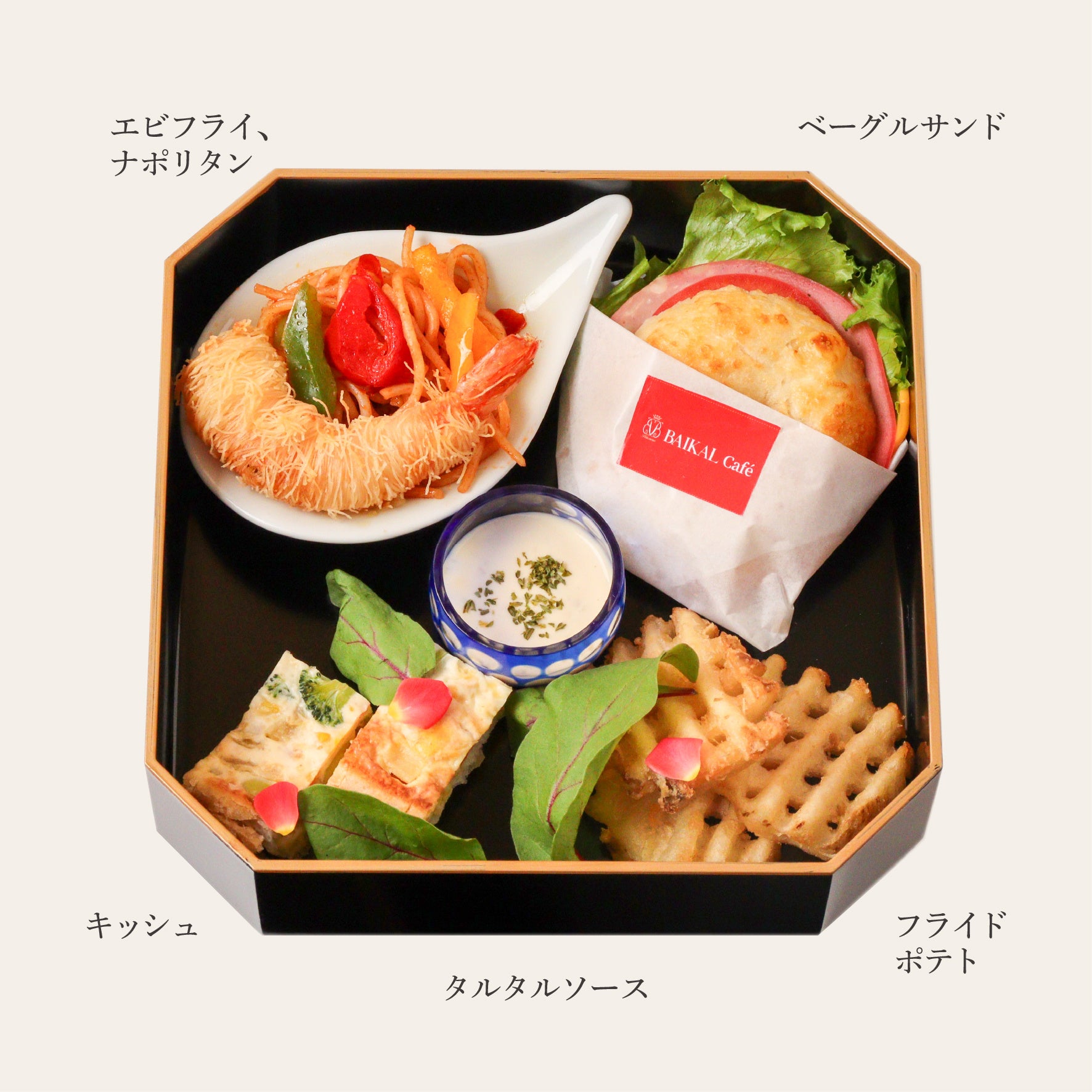 二段重には、彩り豊かなバイカルのプチケーキとライトミールを詰め合わせました。