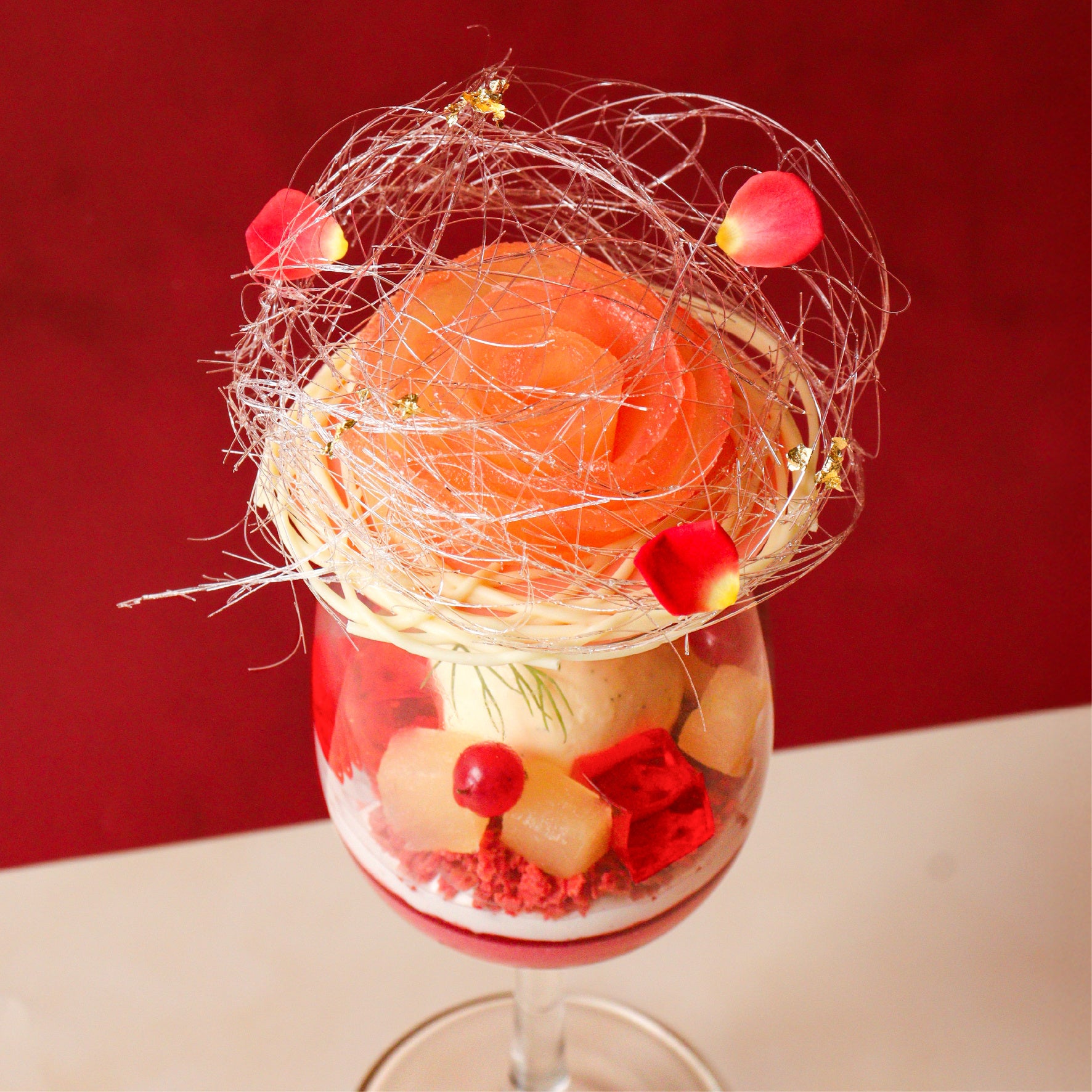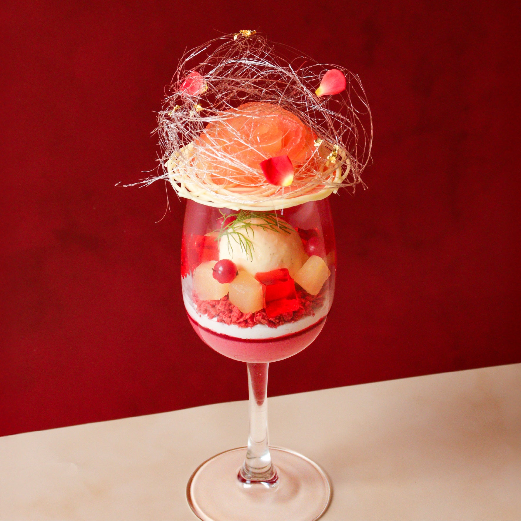グラスの中にはブランドカラーである「赤」を基調に、ほんのりとバラの香りを忍ばせました。