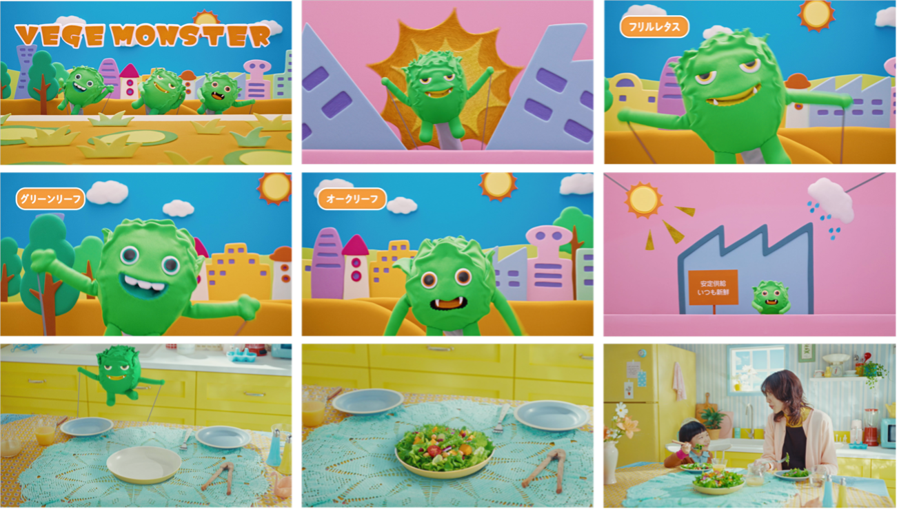 オリジナルキャラクター「ベジモンスター」をパペット化し、「ベジベジモンスター、ベジモンスター」のキャッチーなメロディーにあわせてフリルレタス、グリーンリーフ、オークリーフが楽しげに踊り、「RYODENはみんなの笑顔のために、安心安全な工場野菜をお届けします」のメッセージを伝えます。
