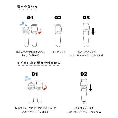 すぐに使いたい場合は、氷を入れてキャップを閉めるだけ。外出先で購入した飲み物を注げば、キンと冷えたドリンクを楽しめます。ペットボトルのままではすぐにぬるくなってしまう飲み物も、ボトルを使うことで最後まで爽快に飲めるのです。