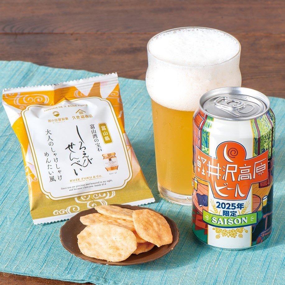 『軽井沢高原ビール2025年限定』は、桃や南国フルーツのような華やかな香りが特徴です。『しろえびせんえび』の香ばしさや塩味と、ビールのフルーティーな香りが相性抜群です。
