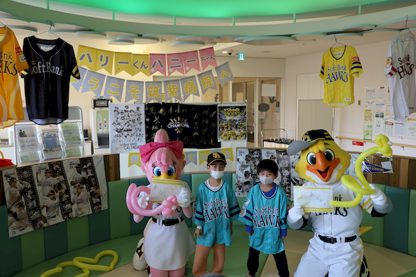 福岡大学病院と福岡大学筑紫病院の小児病棟に、福岡ソフトバンクホークスの公式キャラクターであるハリーとハニーが訪れ、入院中の子どもたちと交流しました。