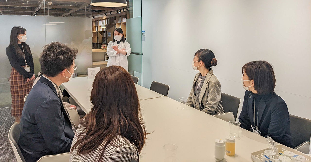 サティス製薬では、学生のみなさんに働くイメージを持っていただくため、仕事の現場を紹介する場を設けています。コロナ禍では自宅にいながら現場を感じられるように、オンライン職場見学や、学生宅へ化粧品を郵送して企画づくりを行うオンラインでのインターンシップを実施。現在は、23年卒学生向けに採用イベントを開催しています。