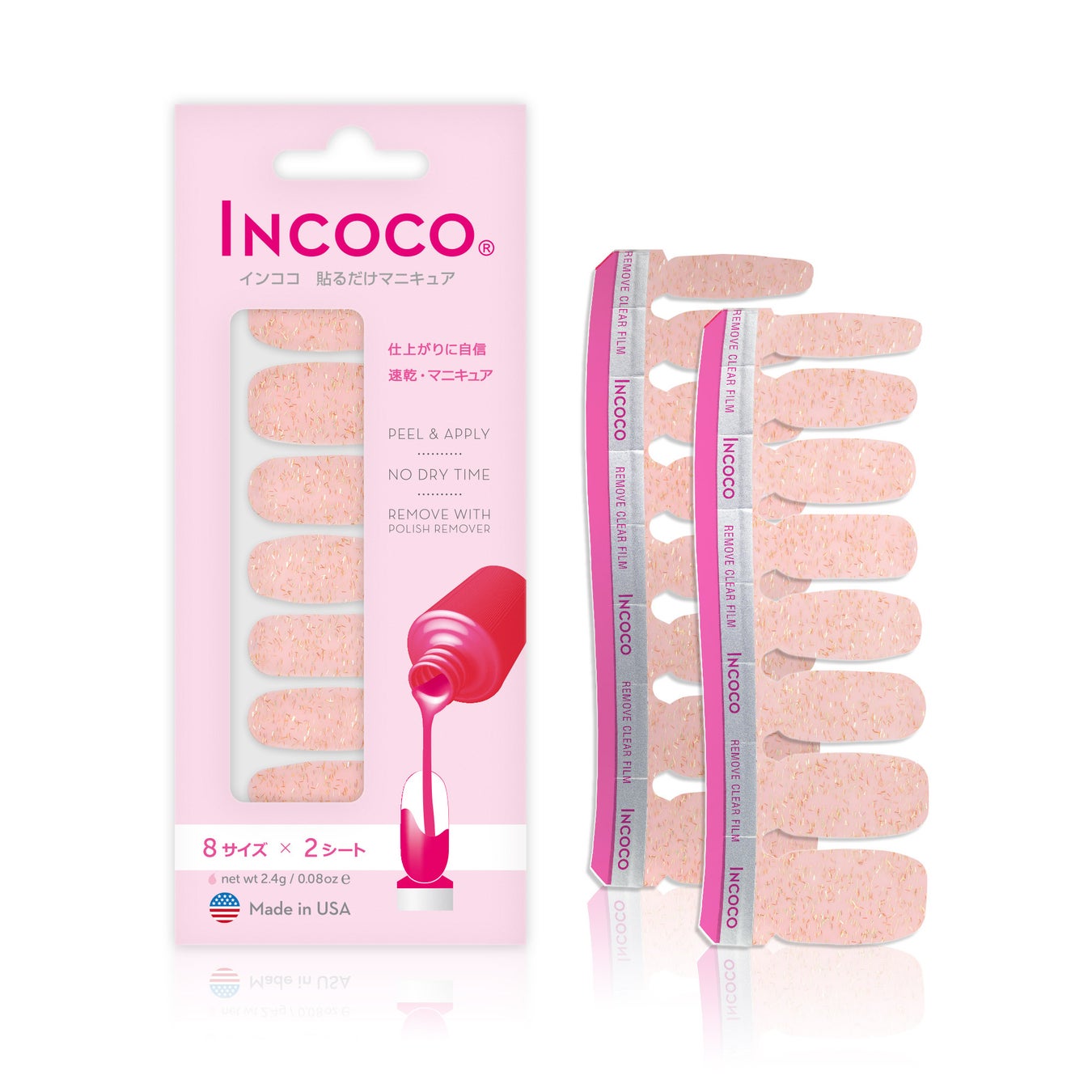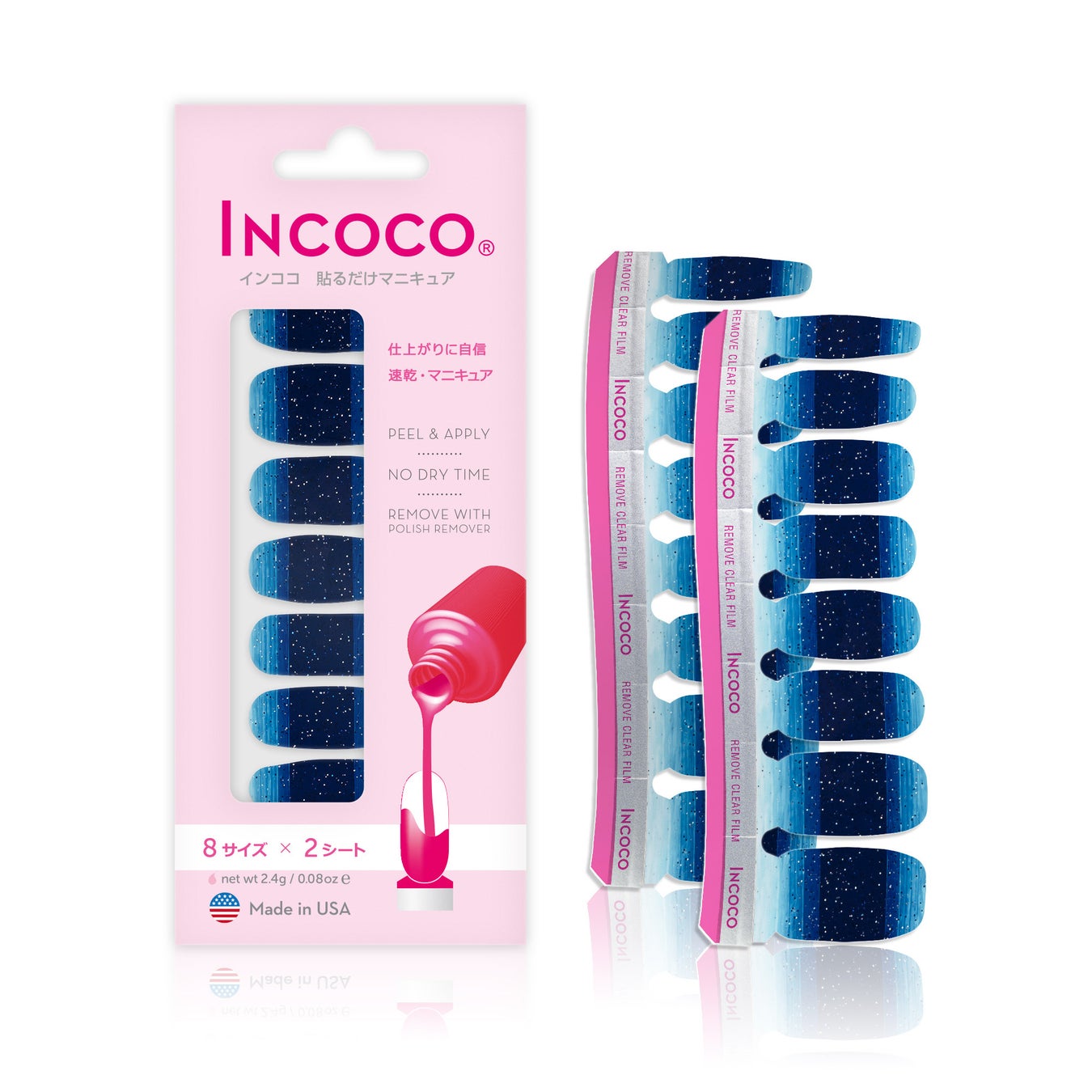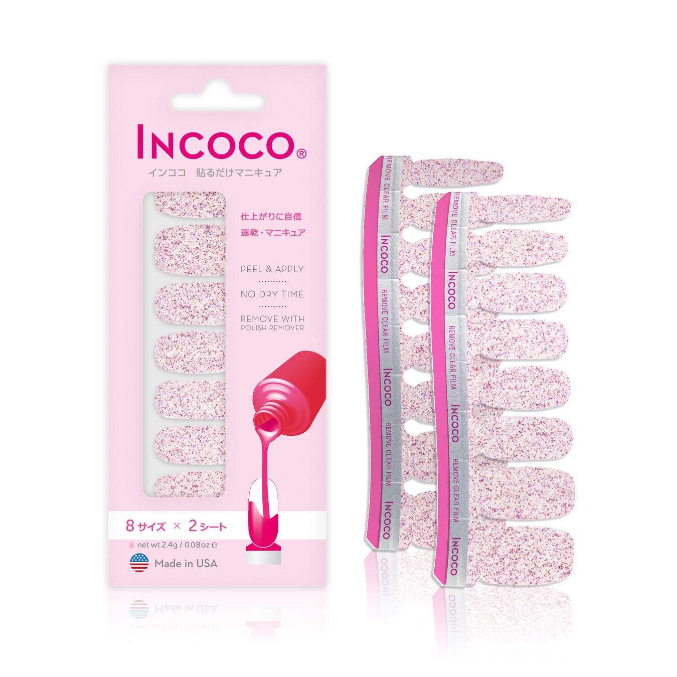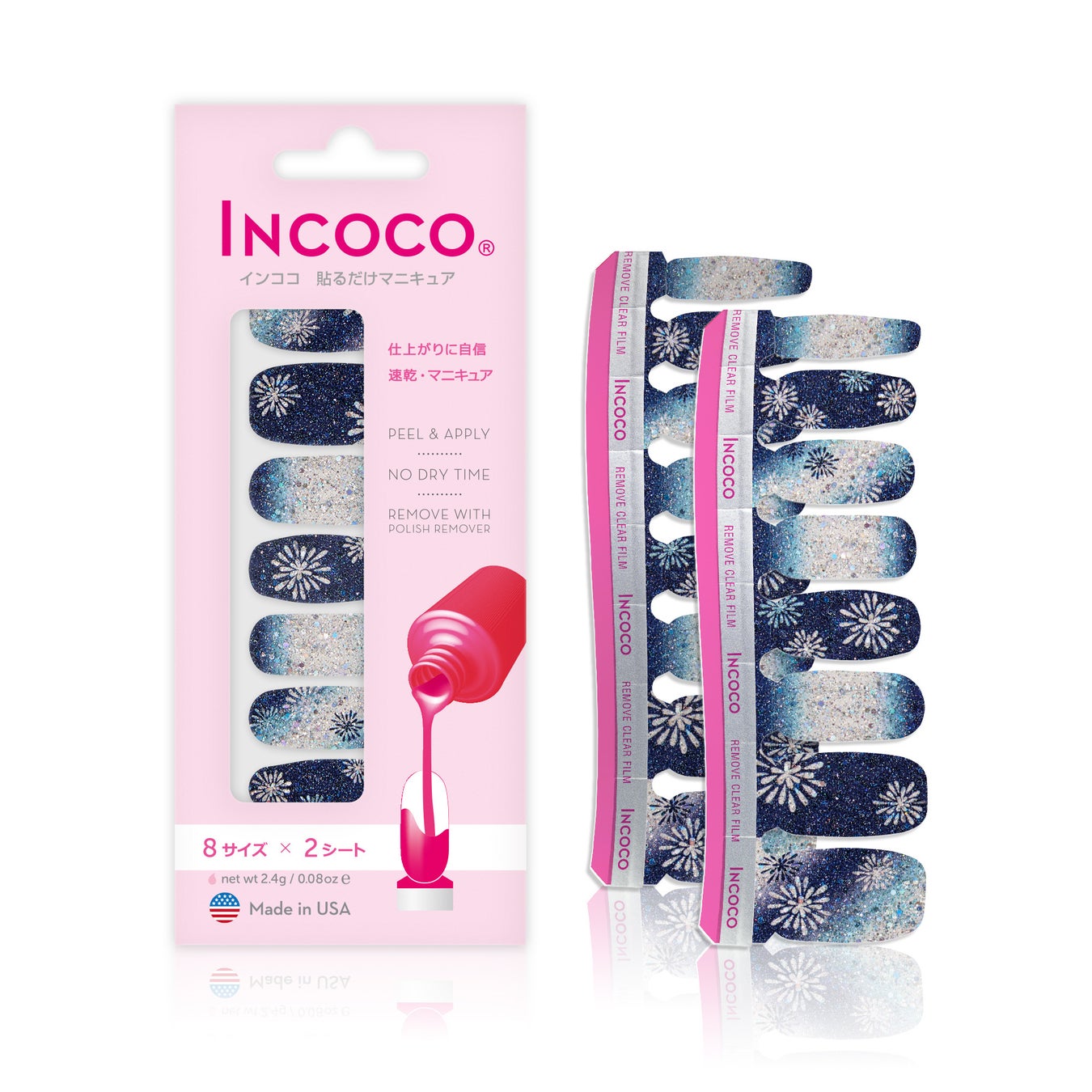 インココはシートが柔らかくて伸張性があるため、優しく伸ばして微調整をしたり指先でカットすることができます。そのためハンドもフットも兼用、同じ商品をそのまま使うことが出来ます。サンダルシーズンには欠かせないフットネイルも、是非インココで手軽にお楽しみください。