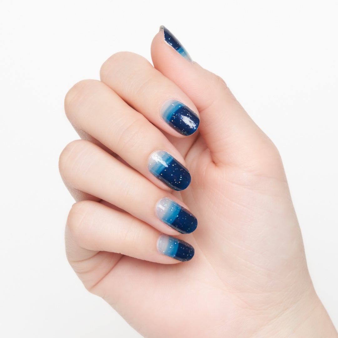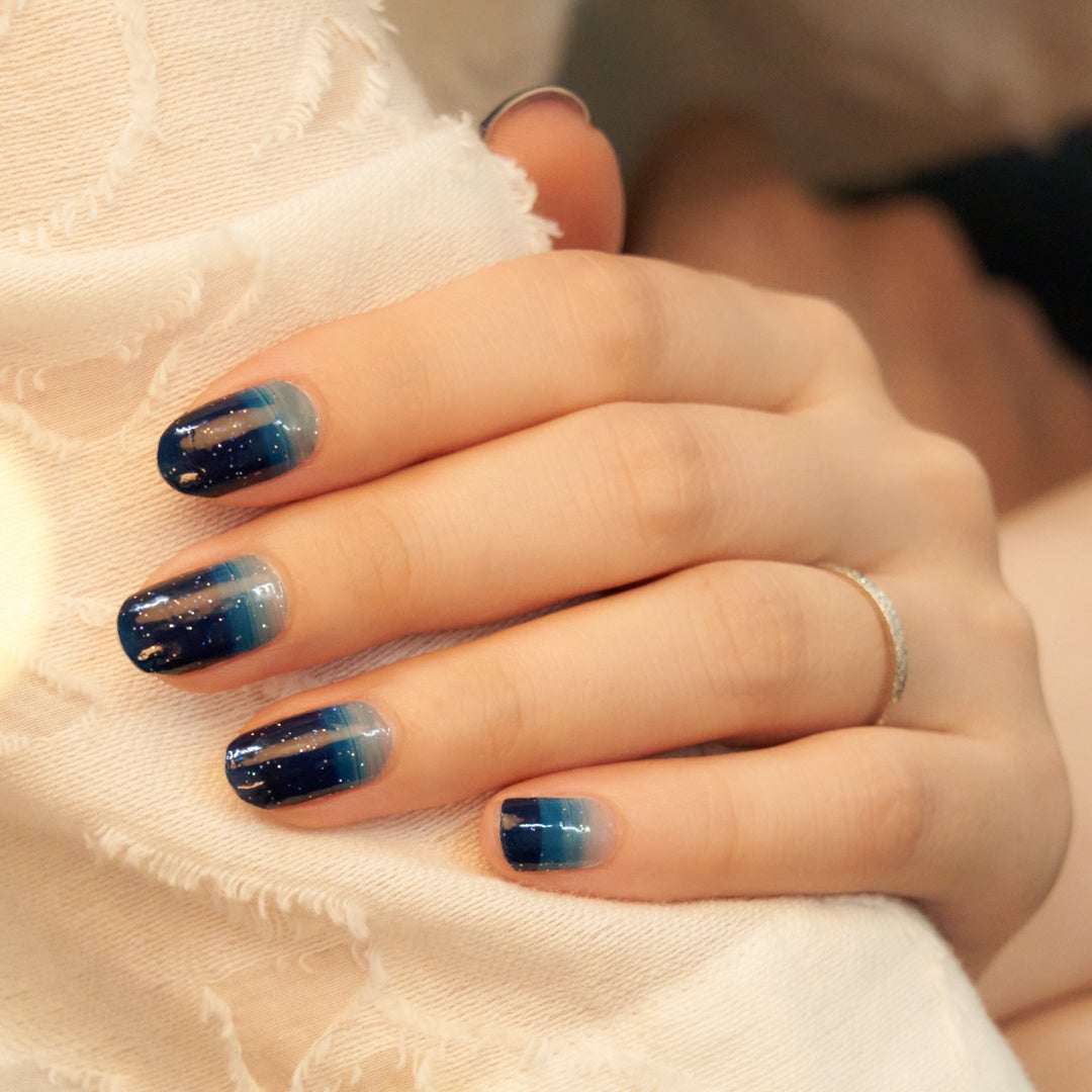 クリア(透明)ベースに、ネイビーを乗せたグリッターデザインネイル。月明りに照らされた夜の海のような、濃淡をつけたネイビーが神秘的なデザインです。指を動かすとオーロラカラーの細やかなラメがキラキラと輝きます。根元がクリアなので爪が伸びても目立ちにくいところもポイント。