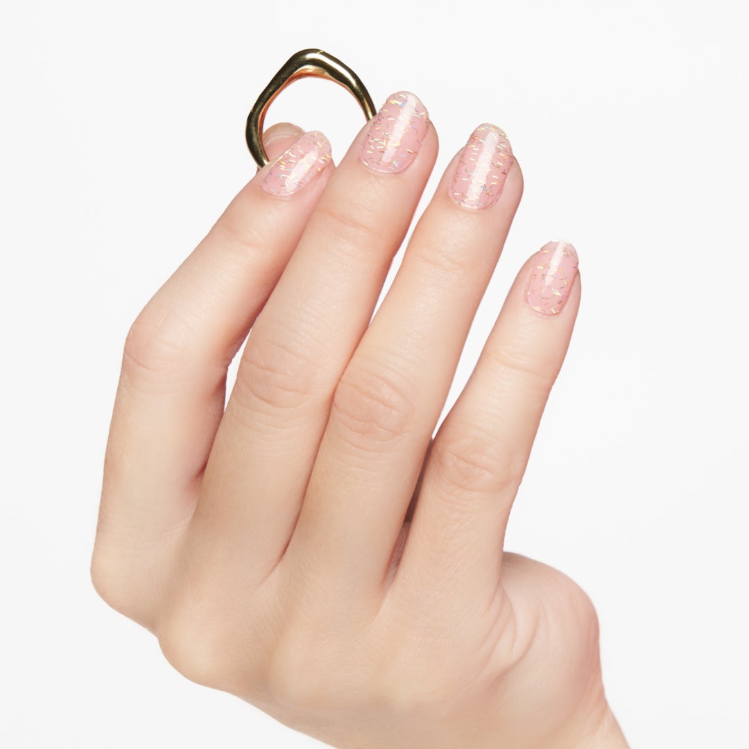 角度によってキラキラと色が変化して見えます。いちごミルクのような柔らかな発色のベースカラーは自然な明るさがあり、指をスラリと長く見せてくれるところもポイント。
