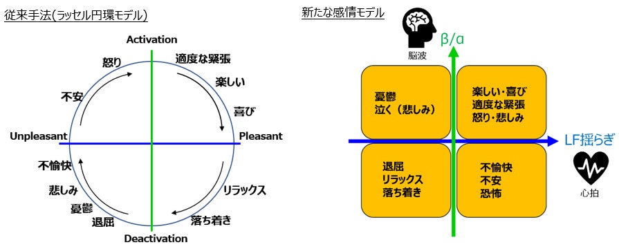 (※5) 複数の被験者に楽しい、悲しい、などの感情を惹起する映像(感情数46、総時間12,886秒)を視聴してもらい、80%の時間で、視聴中に被験者が感じた感情の位置と新感情モデルでの推定位置が一致したことを確認
