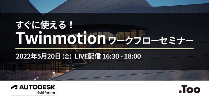 クリエイティブ市場の総合商社・株式会社Too(本社/東京都港区虎ノ門3-4-7、社長/石井剛太、資本金/1億円)は、オンラインLIVE配信セミナー「すぐに使える!Twinmotionワークフローセミナー」を2022年5月20日(金)に開催します。