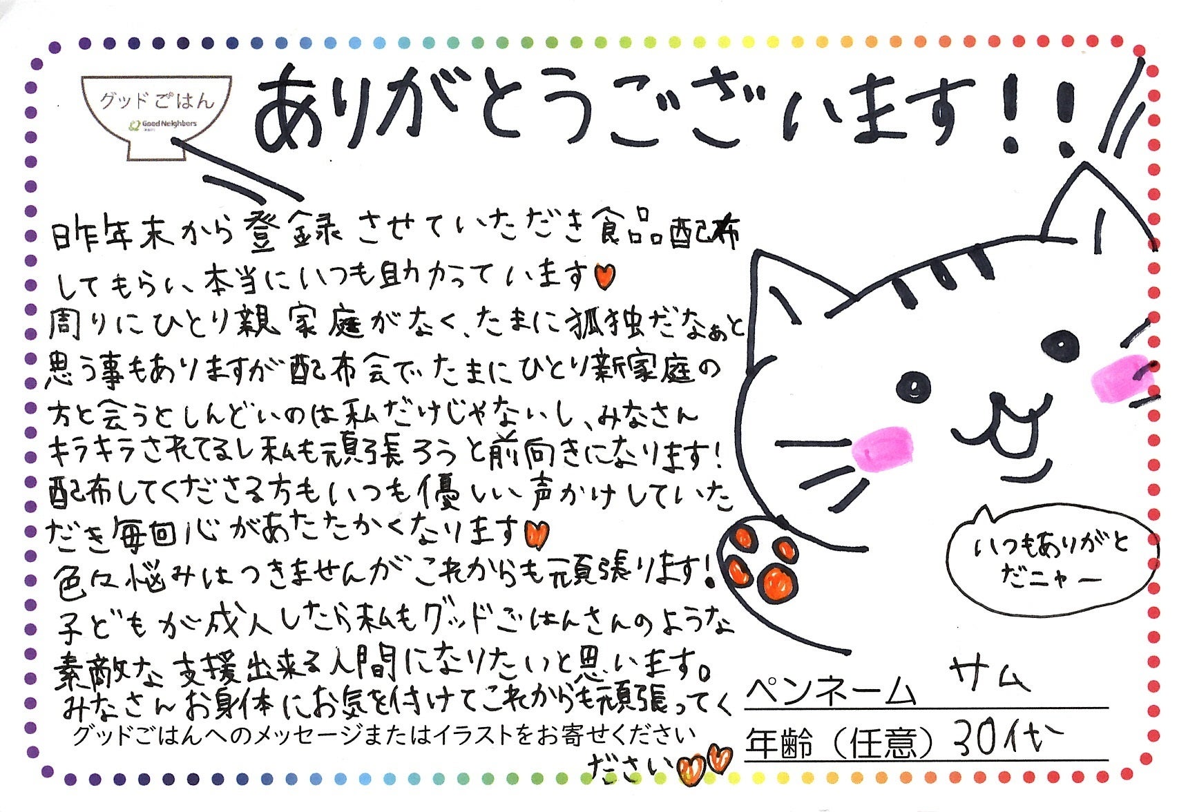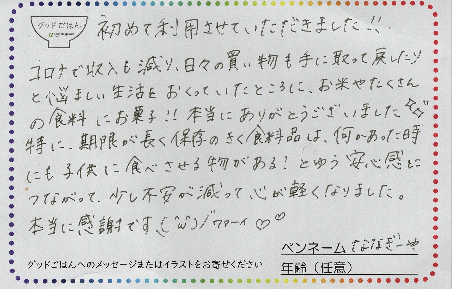 - 「●●拠点に配付設定があり大変ありがたいです。(以前は遠方の設定しかなく受取を諦めていました)成長期の子どもたちにはお腹いっぱい食べさせてあげたいので、定期的な食料支援を心強く思っています。」