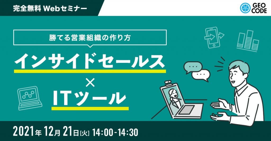 株式会社ジオコード(本社:東京都新宿区、代表取締役社長:原口 大輔、証券コード:7357)は、12月21日(火)にWebセミナー「勝てる営業組織の作り方 ~インサイドセールス×ITツール~」を開催します。