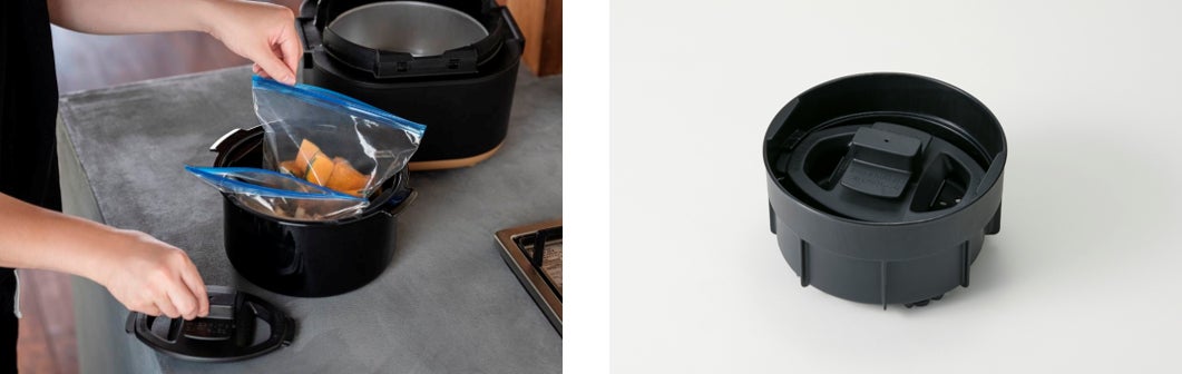 食材を入れたジッパーつき食品保存袋※2を、ホーローなべにセットした「パックホルダー」に入れ、水を入れて、調理時間を指定してスタートさせれば、同時に最大2品※3まで簡単調理ができます。また、食材をジッパーつき食料保存袋に入れ、冷凍・冷蔵保存しておけば、忙しい時でもさっと取り出し、調理するだけなので、手間なく充実した食卓にすることができます。
