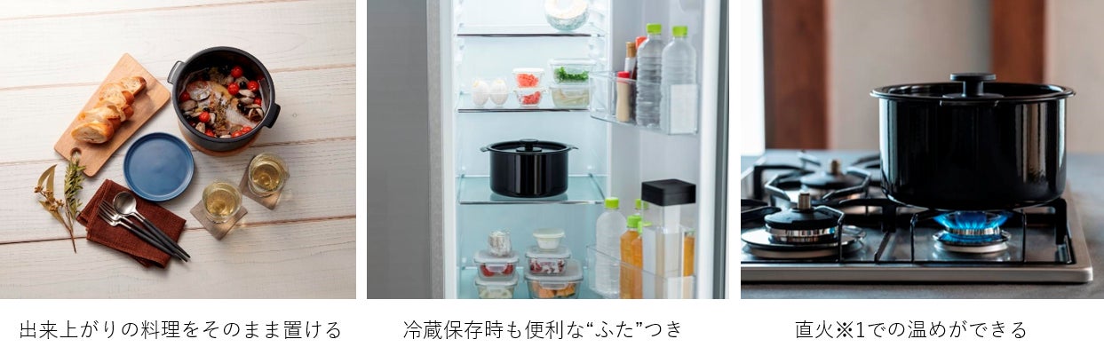 腐食しにくく、色移りしにくい「ホーローなべ」を採用。蓄熱性が高いので、料理のおいしさを引き出してくれます。また、出来上がりの料理をそのまま食卓に置くことができ、テーブルに映えるデザインです。調理後は、なべごと冷蔵庫に保存する際にも便利な“ふた”がついており、なべはガスコンロの直火※1に直接かけられるので、温め直しなど手軽にできます