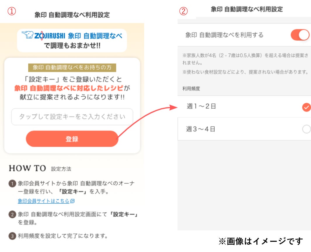 2.「me:new」アプリをインストールして「設定」から「象印 自動調理なべ利用設定」を選択し、①「設定キー」を登録(画面左側)、②利用頻度(画面右側)を選択