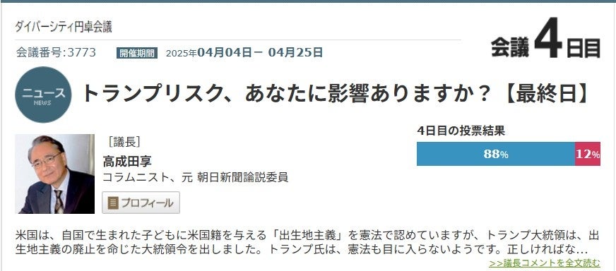 働く人たちの多様な視点が集まる「ダイバーシティ円卓会議」No.3773の会議テーマは、「トランプリスク、あなたに影響ありますか?」。議長に高成田享氏(コラムニスト、元 朝日新聞論説委員)を迎え、2025年4月4日(金)から25日(金)まで、4回にわたり議論を行いました。