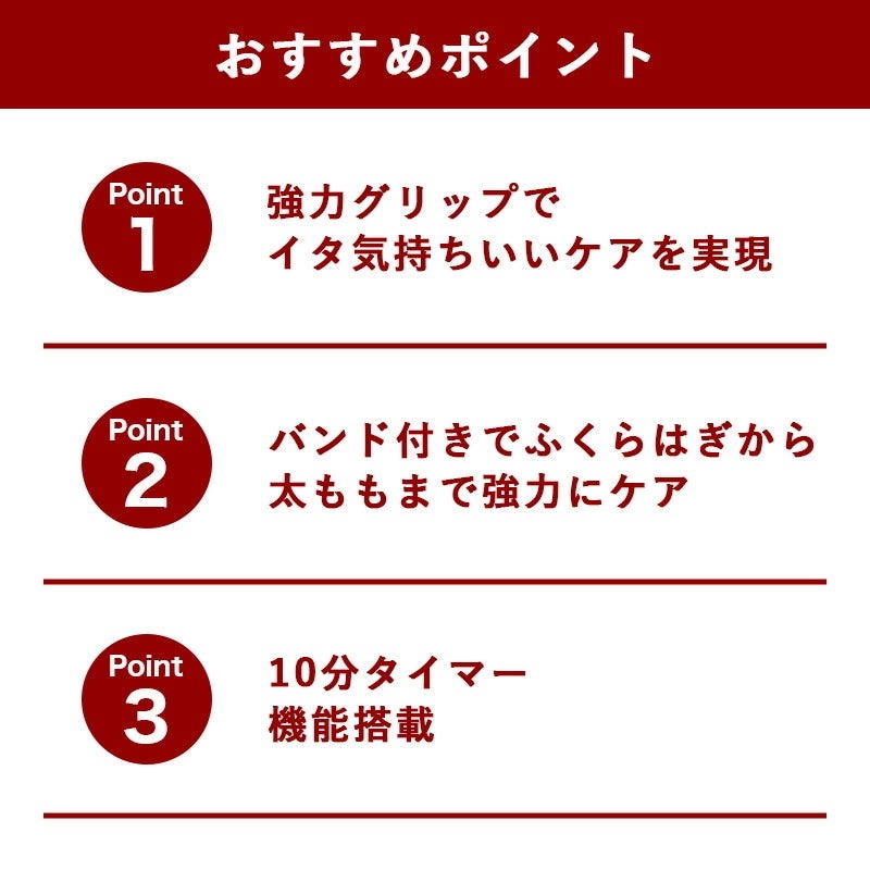 ふくらはぎに加え、太もものケアもできる設計は、デスクワークや立ち仕事が多い現代人にとって最適です。くらはぎへの使用は健康志向の方に、太ももは美容に気を使われている方にぴったりのアイテムとなっています。