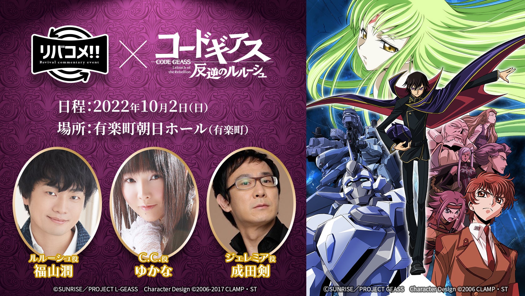 人気声優・福山潤さん、ゆかなさん、成田剣さん登壇の生コメンタリーイベント「リバコメ!!×TVアニメ『コードギアス 反逆のルルーシュ』10月2日(日)開催