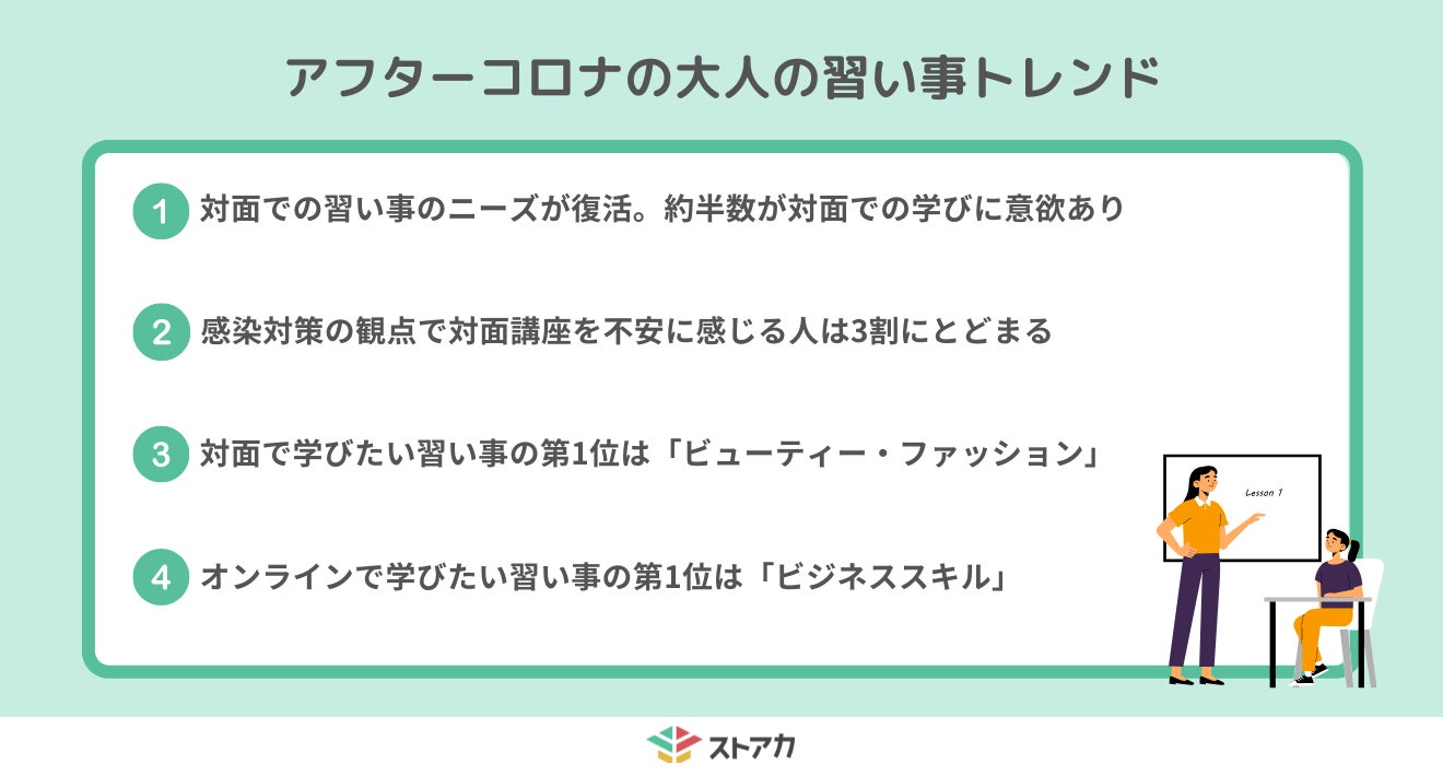 - 対面での習い事のニーズが復活。約半数が対面での学びに意欲あり